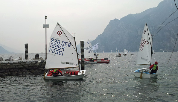 „Insgesamt 1127 Optimist-Segler aus 30 Nationen trafen sich zur weltweit größten Einhandregatta auf dem Gardasee. Bei eisigen Temperaturen und oft strömendem Regen fand das 31. Lake Garda Meeting statt. Die WSV-Jüngstensegler Björn und Eric waren schon seit dem 23. März in Italien, um sich als Mitglieder des Sailing Teams HaWei mit Trainer Harald Weichert vorzubereiten, der mit drei Co-Trainern und vier Motorbooten angereist war, um bestmögliche Unterstützung beim Vorbereitungstraining und während der Regatta zu geben.