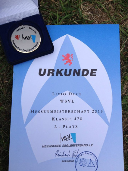 Einen weiteren Vize-Hessenmeistertitel 2013 für den WSV – zumindest einen halben – können wir heute vermelden. Unser Livio Duce hat mit Sandra Volz vom DSCL bei der Gießener Lahntalregatta in der 470er-Klasse den Sprung aufs Hessen-Podest geschafft. Wir sagen: Herzlichen Glückwunsch! Außerdem gratulieren wir Björn und Tina (beide DSCL), die die Bronzemedaille nach Langen geholt haben. Somit sind vier der sechs Plaketten an den Waldsee gegangen.