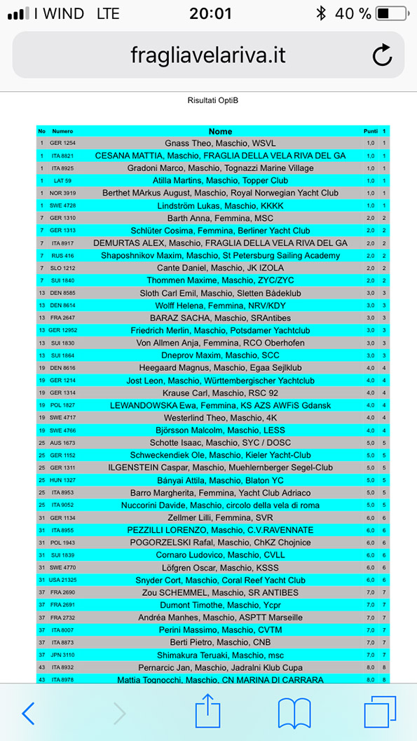 Aber das aus WSV-Sicht fantastischste ist, dass nach dem ersten Regattatag unter 924 Startern aus mehr als 30 Nationen bei den Juniori (vergleichbar mit unseren A-Optis) ein WSVler das Feld anführt. Wir reiben uns gerade kollektiv die Augen.