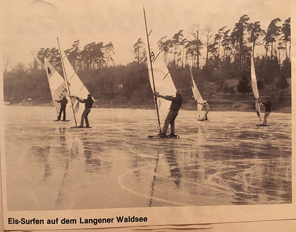 Seit 1978 haben wir eine eigene Surfabteilung (mehr dazu in einem späteren Beitrag) und schnell war vielen klar, dass Windsurfen nicht nur auf flüssigem, sondern auch auf festem Untergrund ganz gut funktioniert. Zitat aus einem Zeitungsbericht von damals: „Durch den starken Wintereinbruch des Jahres 1981 kamen die Eissurfer am 24./25.1. 1981 erstmals (Anm. d. Verf.: erstmals im Jahr 1981. Auch zuvor waren schon WSV-Eissurfer unterwegs) zum Einsatz. Minustemperaturen und eine geschlossene Eisdecke von ca. 10 cm Dicke ermöglichten die ersten Schläge auf blankgeschliffenen Kufen. Besonders am 25.1. herrschten hervorragende Windverhältnisse, so daß dem Geschwindigkeitsrausch nichts entgegenstand. […] Interessierten, die den Bau eines Eissurfers anstreben, stehen Willi Knöchel und Günther Liedtke als erfahrene Konstrukteure und Piloten, sicherlich gern mit Rat und Tat zur Seite.“
