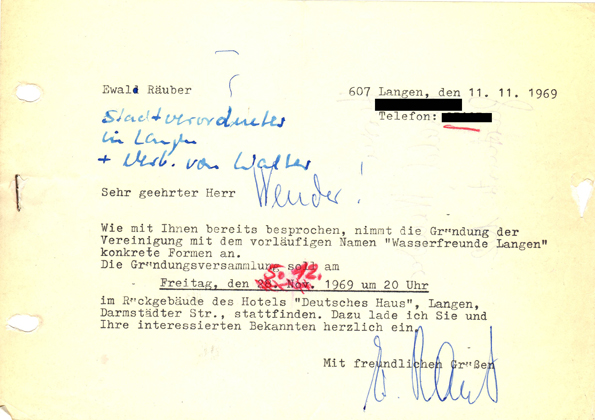 Ja, liebe Leute, draußen ist Karneval! Und das führt uns direkt zurück in die Historie unseres Vereins im Herbst 1969. Am 11.11. nämlich setzte der damalige Langener Stadtverordnete Ewald Räuber ein Schreiben an seinen Bekannten Harald Wender auf, in dem er ihm, wie sie es zuvor besprochen hatten, die Einladung zur Gründungsversammlung einer Vereinigung mit dem vorläufigen Namen „Wasserfreunde Langen“ avisierte. Gegründet wurden diese dann am 20. November 1969 als Abteilung der Sport- und Sängergemeinschaft Langen. Am 5. Dezember ging im Hotel Deutsches Haus die erste Versammlung der Wasserfreunde zur Aufnahme von Mitgliedern und zur Wahl eines geschäftsführenden Vorstandes über den Tresen. 44 Personen nahmen teil, von denen 32 ihre Mitgliedschaft durch Beitrittserklärungen beantragten. Zum 1. Vorsitzenden wurde Harald Wender gewählt.