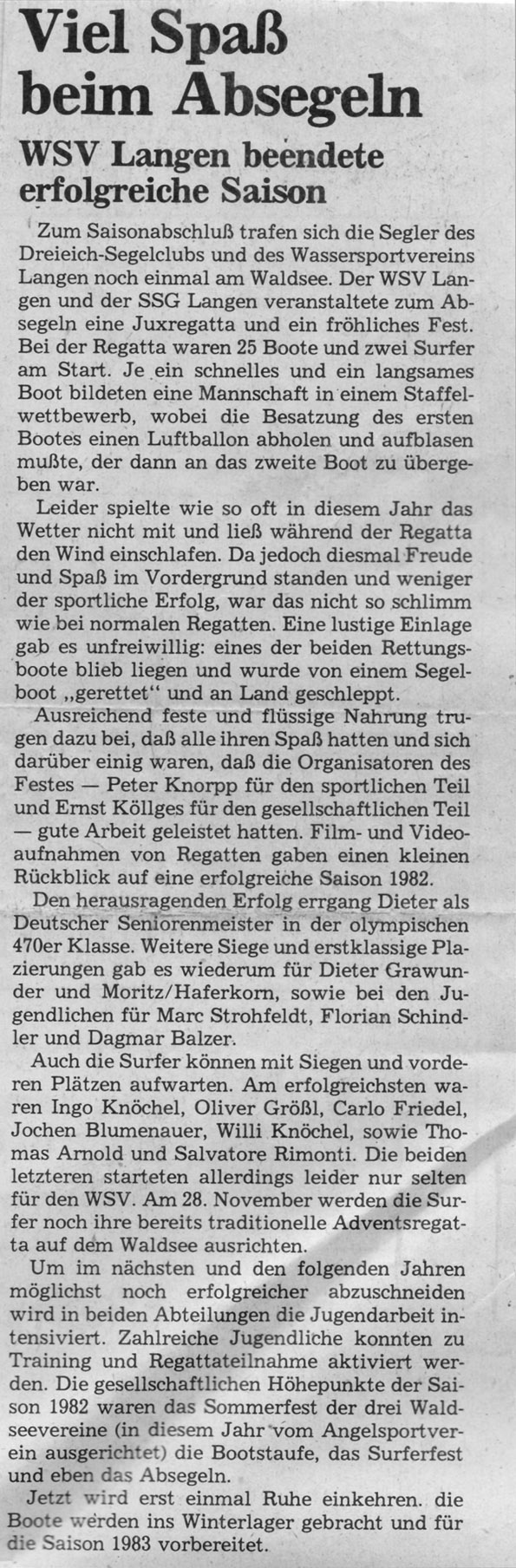 Am kommenden Sonnabend ist bei uns wieder Absegeln angesagt. Seit Jahrzehnten sind wir für selbiges zuständig, während unsere Nachbarn vom DSCL immer das Ansegeln an den Start bringen. Heute schauen wir mal 37 Jahre zurück: