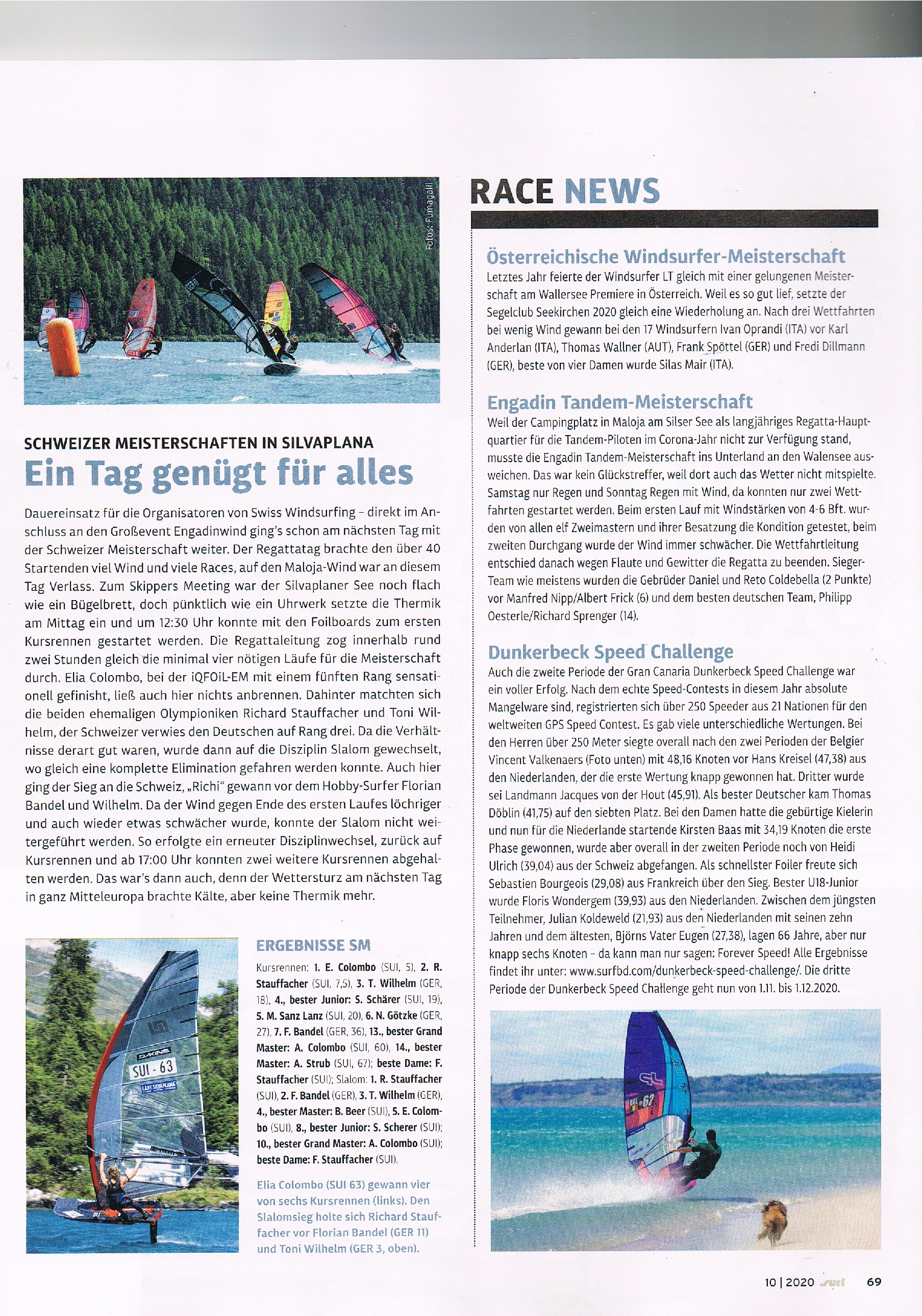 …sind für unseren WSV-Surfer Florian Bandel bei den Schweizer Meisterschaften auf dem Silvaplanersee geflogen, wo er nahe dem namensgebenden Örtchen Silvaplana mal so eben ganz easy den zweiten Platz im Slalom abgeräumt hat. Das hat ihm nicht nur die Silbermedaille eingebracht sondern on top auch noch eine Erwähnung in der Oktober-Ausgabe des Urgesteins unter den Windsurf-Magazinen, der „surf“. Wir gratulieren.